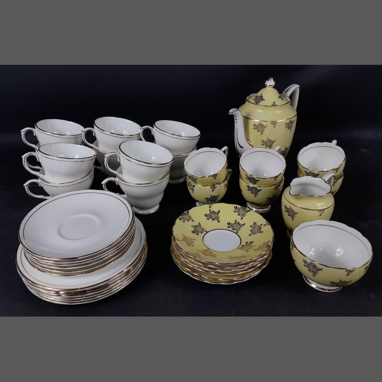 A part service by COLCLOUGH with an ivy pattern to include 5 coffee cups, 3 teacups, 1 teapot, 2 plates (21cm) 2 cake plates, 2 soup bowls, and 8 further various sized bowls and a part ROYAL STAFFORDSHIRE tea set in a green and gilt pattern with floral centre to include 5 cups (3 damaged), 11 saucers, 12 side plates, 2 cake plates, 2 milk jugs, 2 sugar bowls