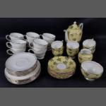A vintage BONDWARE gilt Vintage Fine China Porcelain tea and coffee set to include 7 teacups, 6 coffee cups, 6 saucers (15cm), 6 saucers (11cm), 6 plates (17cm), 1 cake plate (24cm), 2 lidded sugar bowls, 1 coffee pot plus a further gilt coffee set made in Japan to include 6 cups, 4 saucers, 1 bowl, 1 milk jug, 1 lidded sugar bowl, 1 teapot, some fading to the gilt