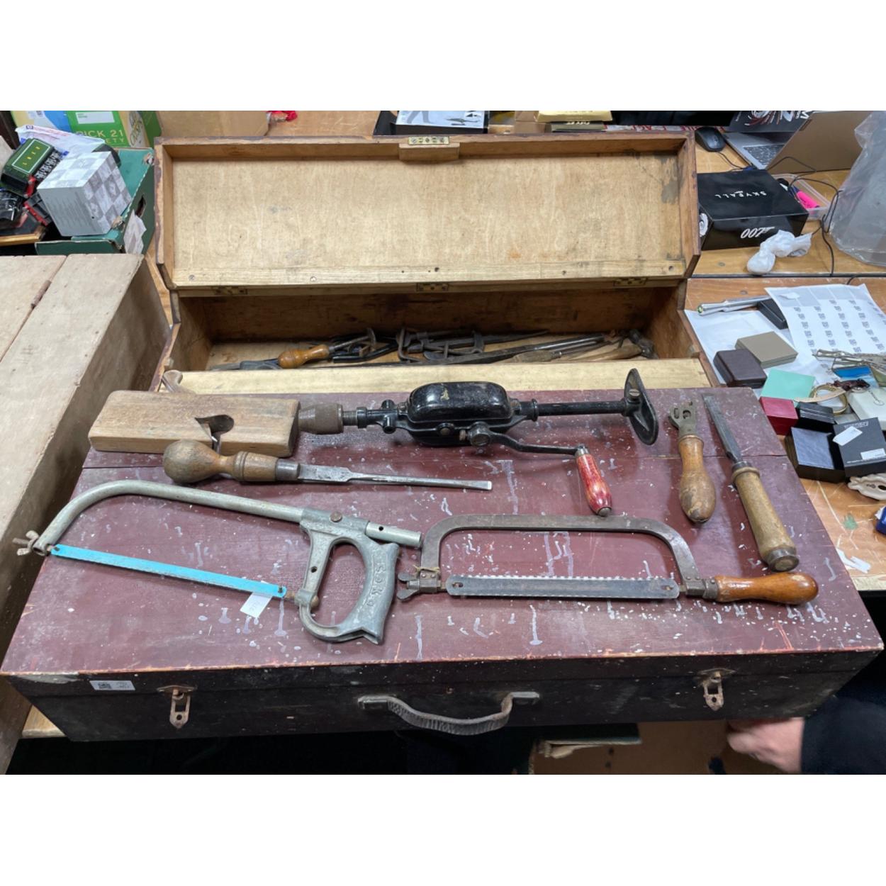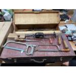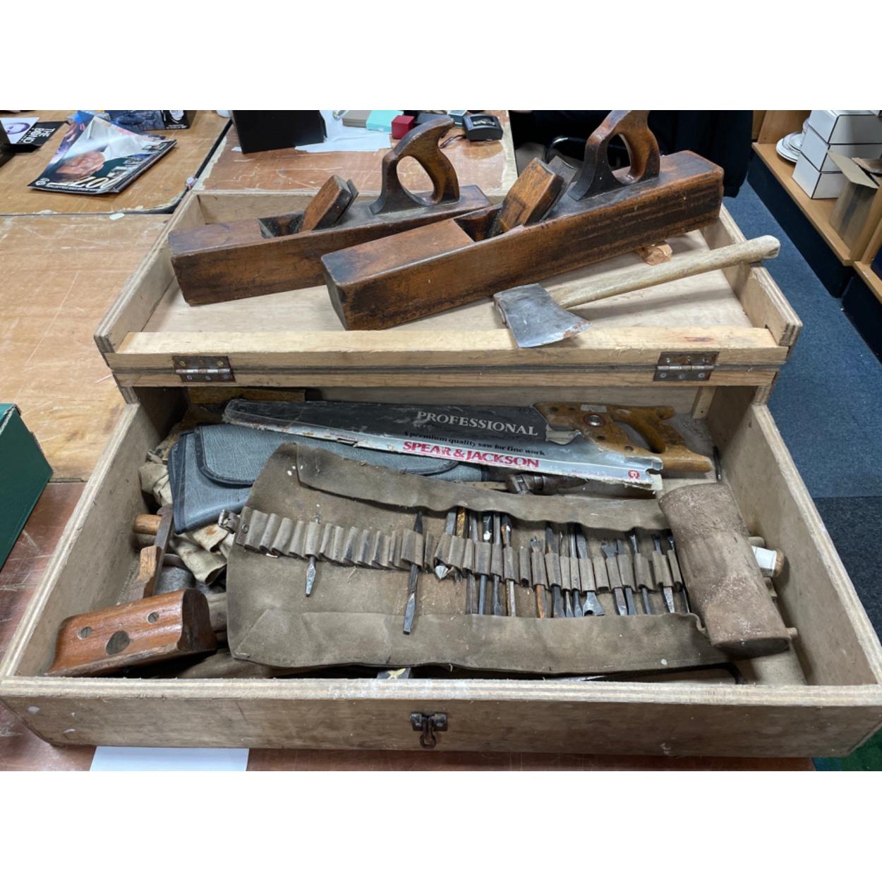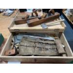 A carpenter's tool box to include 2 vintage wooden planes, wood-carving chisels, and various other old wood-working tools 80x50x18cm