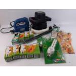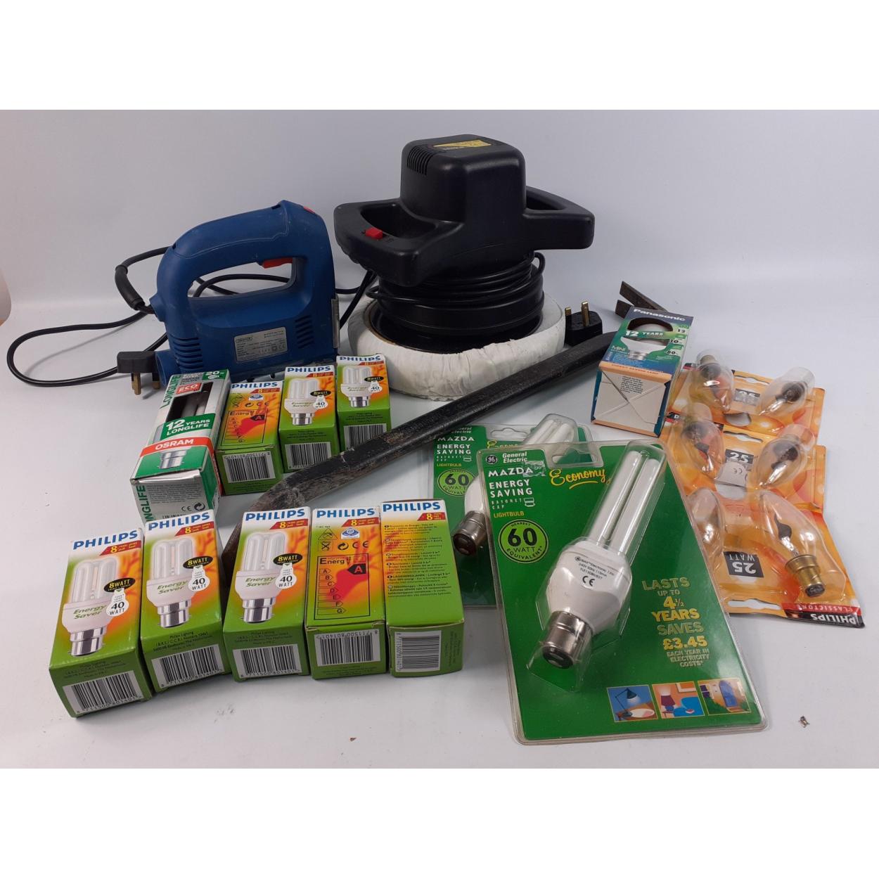 A box containing various household items. HOLKA 91013001 rotary polisher, Draper 75109 jigsaw (no blades), a substantial crow bar and a quantity of modern energy saving light bulbs.