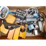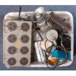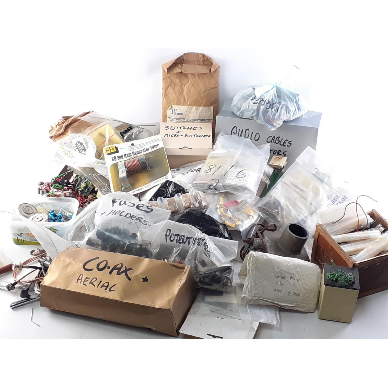 A box of assorted vintage electronic components., switches, dials, bulbs, speakers. etc. An interesting mixed lot.