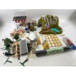 A selection of model railway accessories to include unopened DAPOL 00/H0 trackside kit - general store, village church, water tower, LIMA arch girder bridge, WILLS finecat 00 scenic series - market stalls (ref SS37), scrap yard (ref SS40), occupational bridge with stone abutments single track (ref SS28), HORNBY RAILWAYS trackside accessories (R574), FALLER small market garden (B-213), JAVIS 'Countryside' simulated landscapes- No 9 black tarmac, SLS unopened rough pasture x 2, flexible 'countryside' hedging, cork bark plus readymade bridge over tunnel, platform, various trees, piece of green felt, and X-ACTO TOOLS including a saw set, hand drill, pin vise, No 2 heavy-duty blade assortment, all unopened plus an angular tweezer (opened)