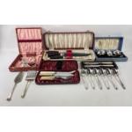 A collection of mainly VINTAGE EPNS presentation boxes of tea spoons, fish knives, cake serving slice, butter knives, a nice cased cruet set and finally a nice quality Sheffield stamped carving set