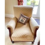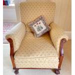 FABULOUS VICTORIAN armchair with claw and ball feet and re-covered in deep yellow pattern fabric around two years ago! ( one of a pair in previous lot) We have included a catalogue picture showing the pair side by side in situ / but selling each chair separately.