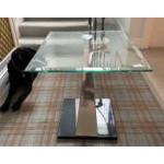 A MARTIN AND FROST unusual glass side table with a stainless steel curved support on a black base - very nice! - dimensions 60cm x 55cm
