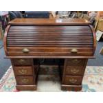 A nice knee hole roll-top mahogany desk circa VICTORIAN c1870/80 in good condition, with an UNUSUAL pull out feature writing top and pull-up writing slope, with ten drawers and original green leather pads - dimensions 3ft length x 2ft depth x 38" height