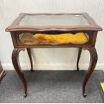 An elegant mahogany glazed hinged-lid and sides bijouterie/trinket display table on cabriole legs - dimensions 65cm x 45cm x 75cm height