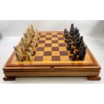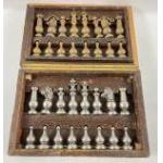 UNUSUAL! A VINTAGE wooden cased brass and white metal CHESS SET, within two layers of the box. Some of the white metal pieces are showing slight wear showing possibly a brass base metal. - dimensions of the largest piece 8cm tall approx - dimensions of the case 27cm x 18cm x 8cm depth approx