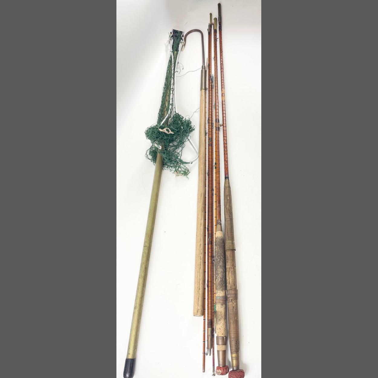 Mix'n'match fishing rods - 2 handles 47" and 44", 3 tips (1 never used) 42", 34" and 40" plus 2 centre pieces 44" and 37", all cane with 2 canvas bags,also a landing net