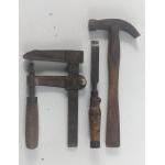 A VINTAGE hand tools to include a wood chisel 10.5" length, a c19th century blacksmith made claw hammer 13" length and a vintage joiner's measuring hand held tool with wooden handle and No3 stamped on it? 10" length approx