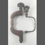 An ARTHUR of EDINBURGH Brass & Wood Brace. Circa early 1800. Brace measures 13 1/2 inches with a 4 inch throw. A nice feel and patina to the beech frame with ebony palm handle and horn inlay. Bit catch will require some renovation - with also a late Georgian/early Victorian hand drill brace dimension 26cm in length