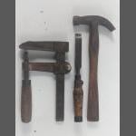 A VINTAGE hand tools to include a wood chisel 10.5" length, a c19th century blacksmith made claw hammer 13" length and a vintage joiner's measuring hand held tool with wooden handle and No3 stamped on it? 10" length approx