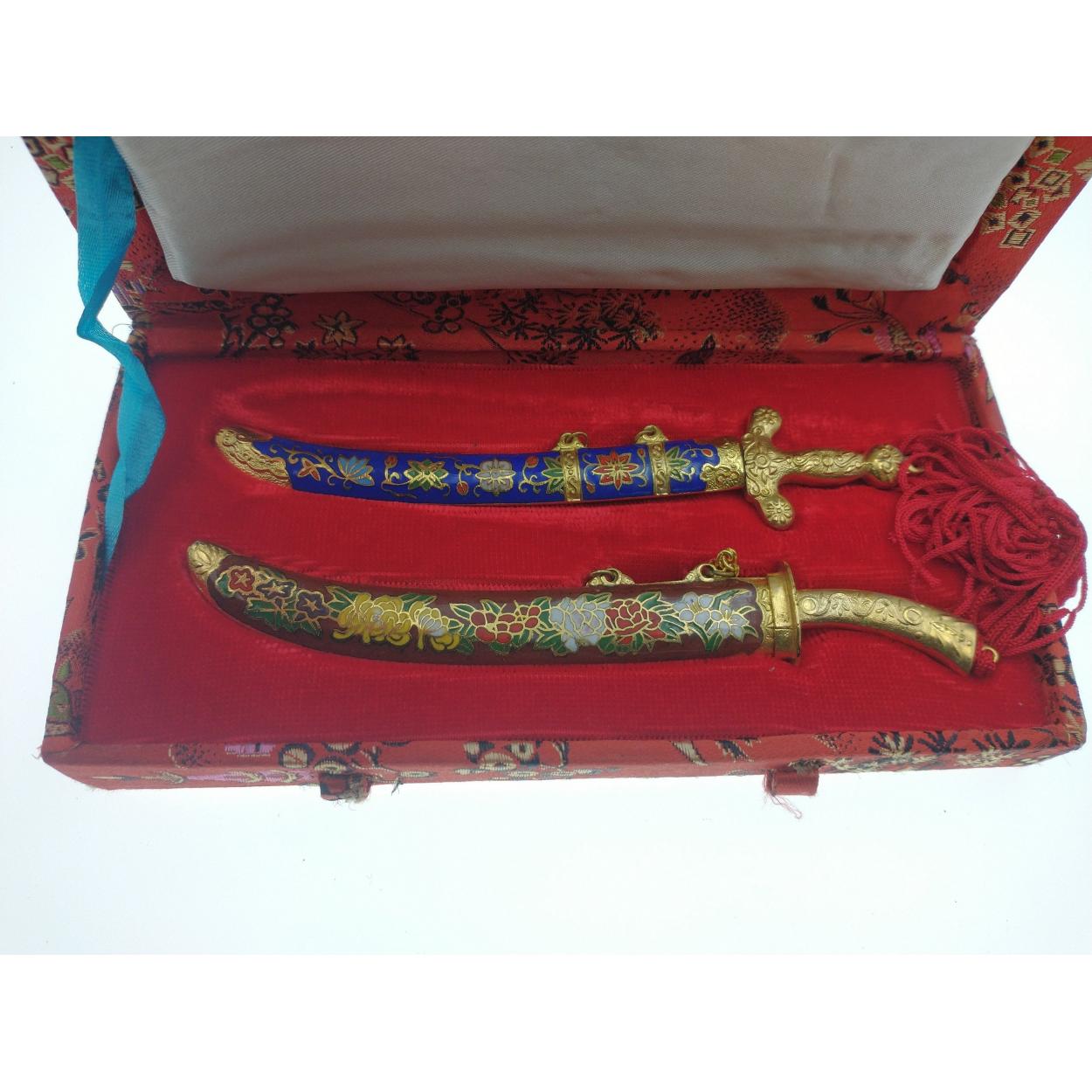 ORIENTAL STYLE padded box containing two Cloisonne minature swords. [ 13cm each sword approx]