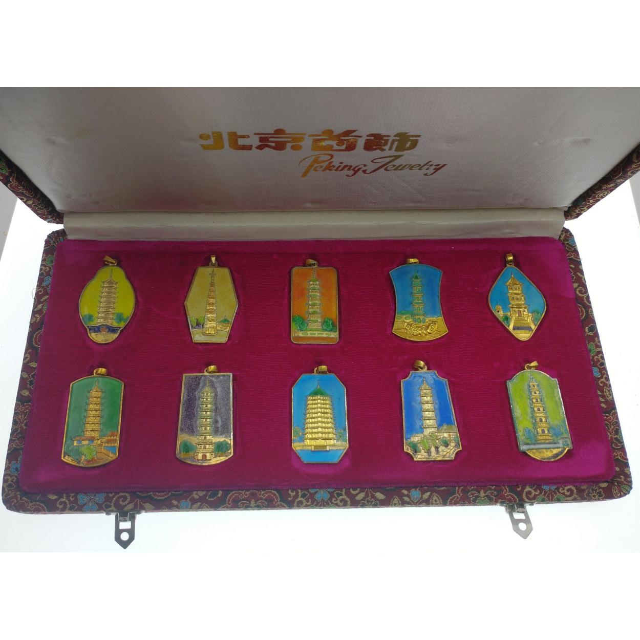 Presentation box containing 10 ENAMELLED pendants depicting PAGODAS [ 4cm x 2.5cm each approx]
