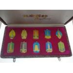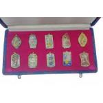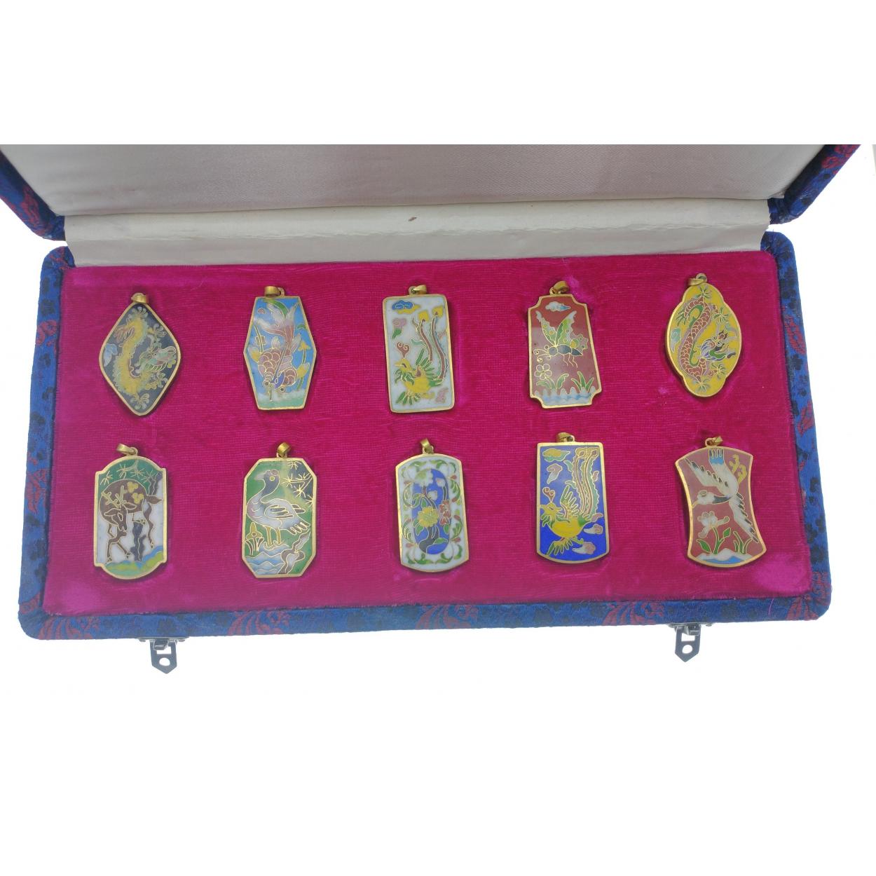 Presentation box containing 10 ENAMELED pendants depicting various oriental symbols [4cm x 2.5cm each approx]