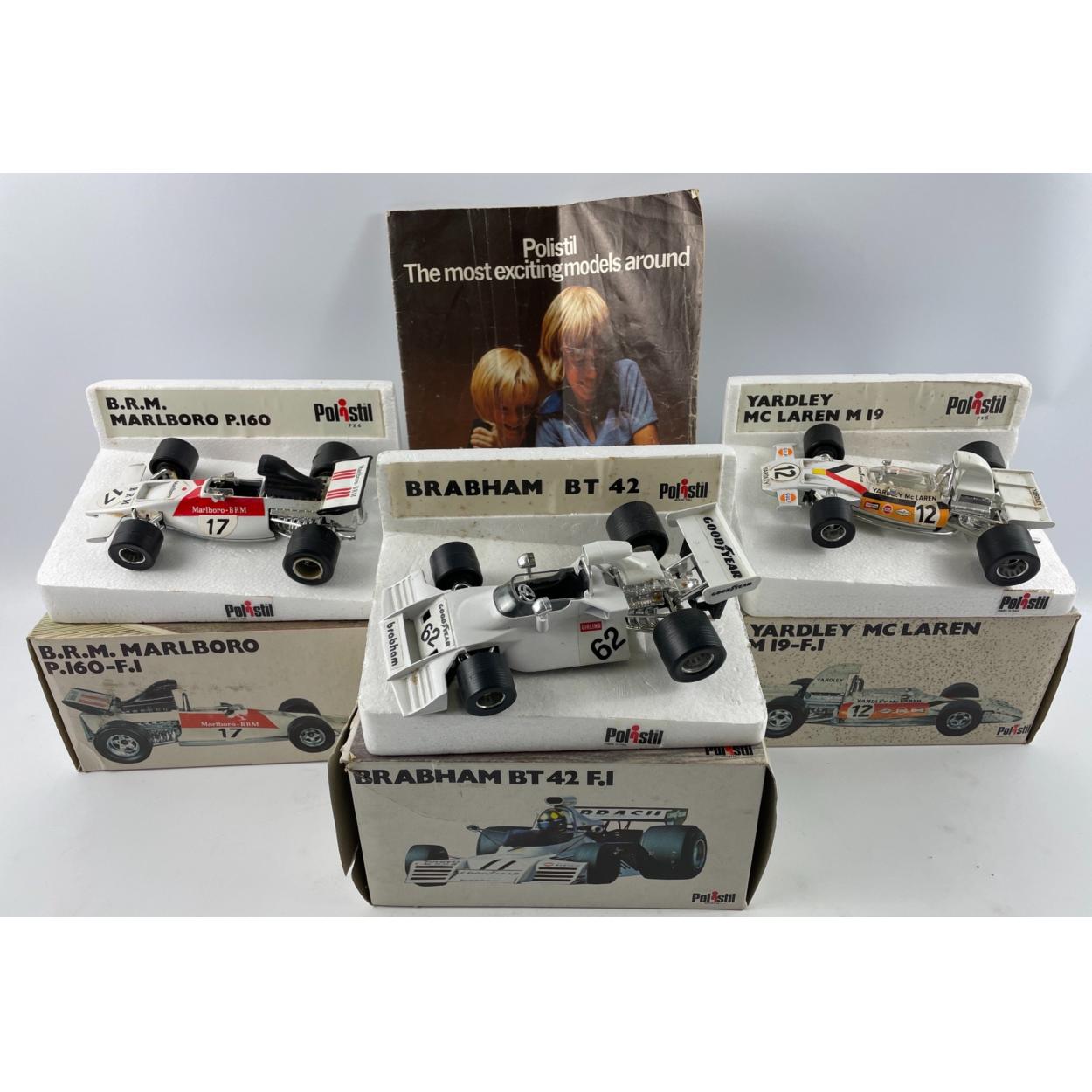 RARE TO FIND - VINTAGE POLISTIL MODEL CARS, all boxed, to include from the F1 series: LOTUS JPS, BRM MARLBORO P160, TYRRELL FORD, FERRARI B3, BRABHAM BT42, and the YARDLEY McLAREN M19