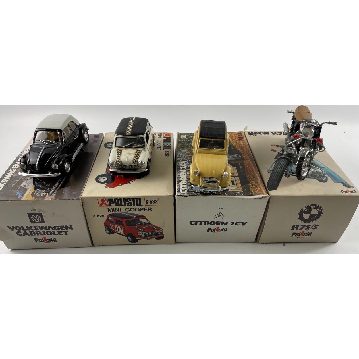 RARE TO FIND - POLISTIL MODEL CARS, in original boxes, to include VOLKSWAGEN CABRIOLET, MINI COOPER S582, CITROEN 2CV, and a BMW R75/5