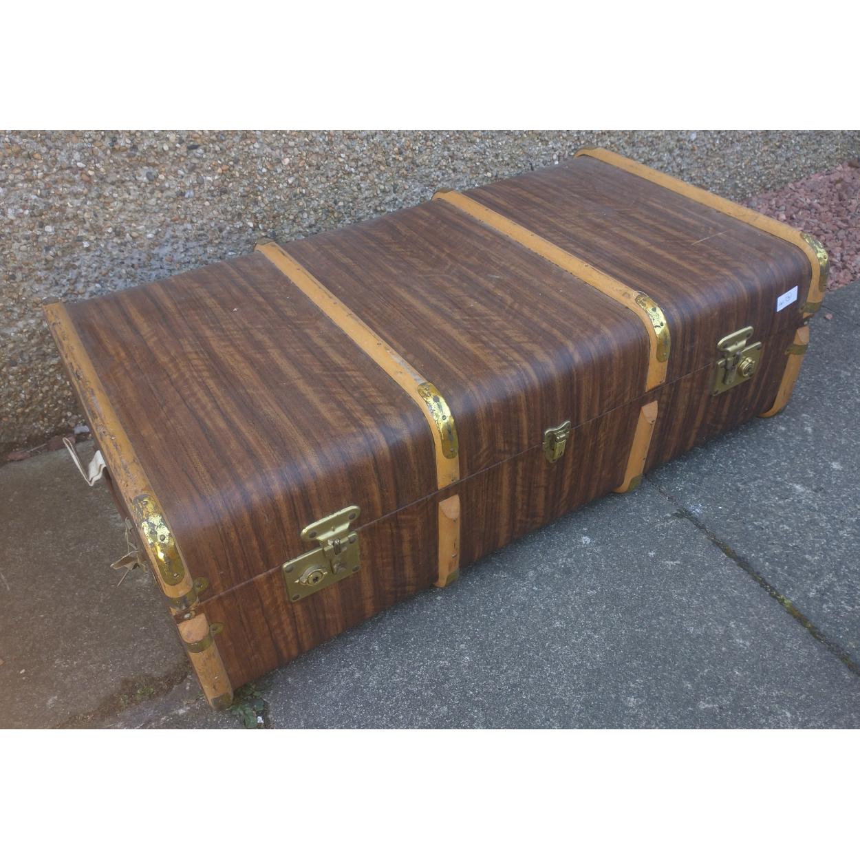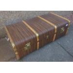 A nice circa 1920's travelling trunk with protective bentwood straps and a nice wooden outer skin effect