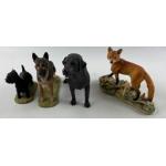 3 BORDER FINE ARTS figures to include a fox standing in fauna ‘ made in Scotland' 12cm tall x 16cm long, a standing ALSATIAN ‘ RUFF RUFF! made in Scotland' 13cm tall x 16cm long, a nice wee SCOTTIE DOG ‘ made in Scotland' 8cm tall x 10 cm long and a nice black Labrador ( unsure if BFA?) 15cm tall x19cm long approximate