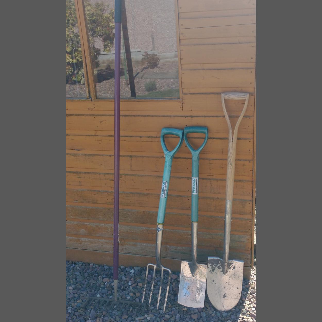 Selection of garden tools to include Yeoman fork and spade, Burton&Ball spade and rake