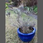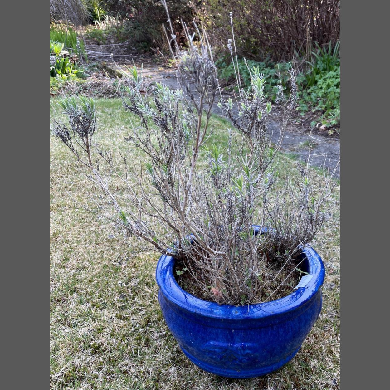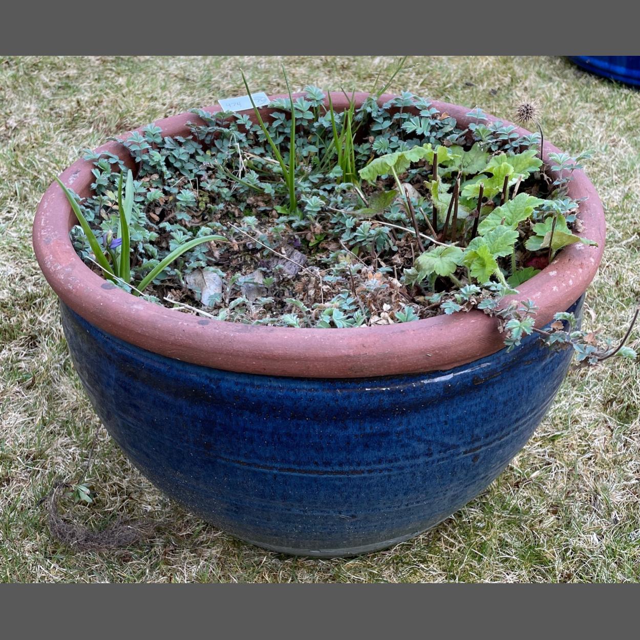 Small BLUE GLAZED garden container with planting ( lavender) 29 cm diameter x 17cm height