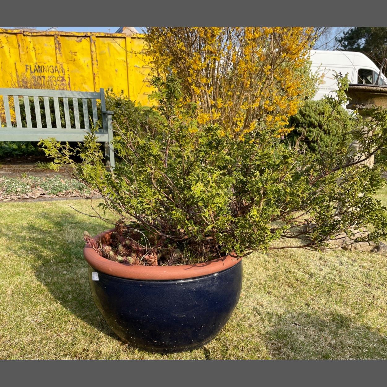 A LARGE TERRACOTTA garden planter with dark blue glaze 46cm diameter x 28cm height with planting