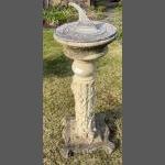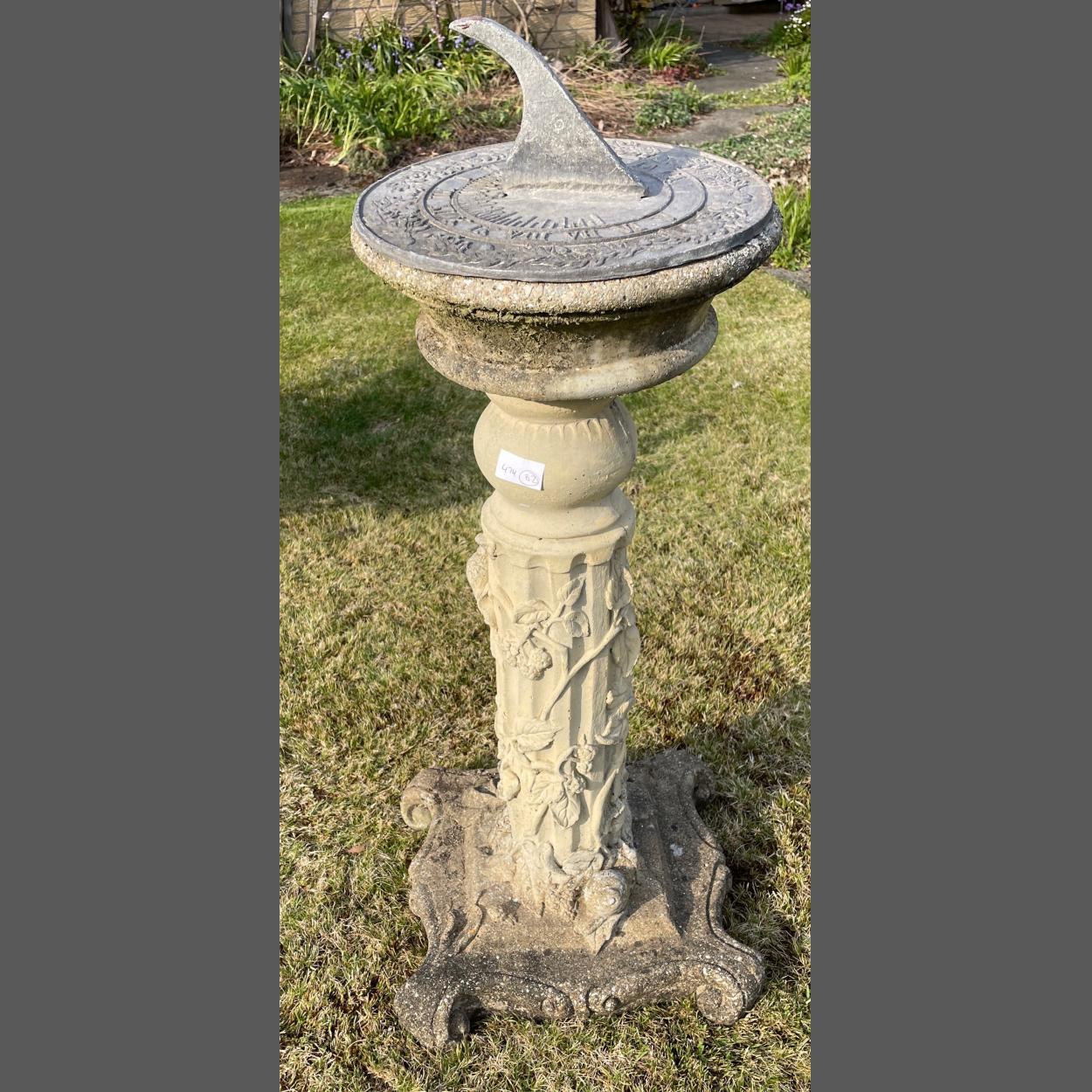 An EXQUISITE garden stone style SUN DIAL adorned with raspberries and acorns with a Verdi- gris patina metal sun dial