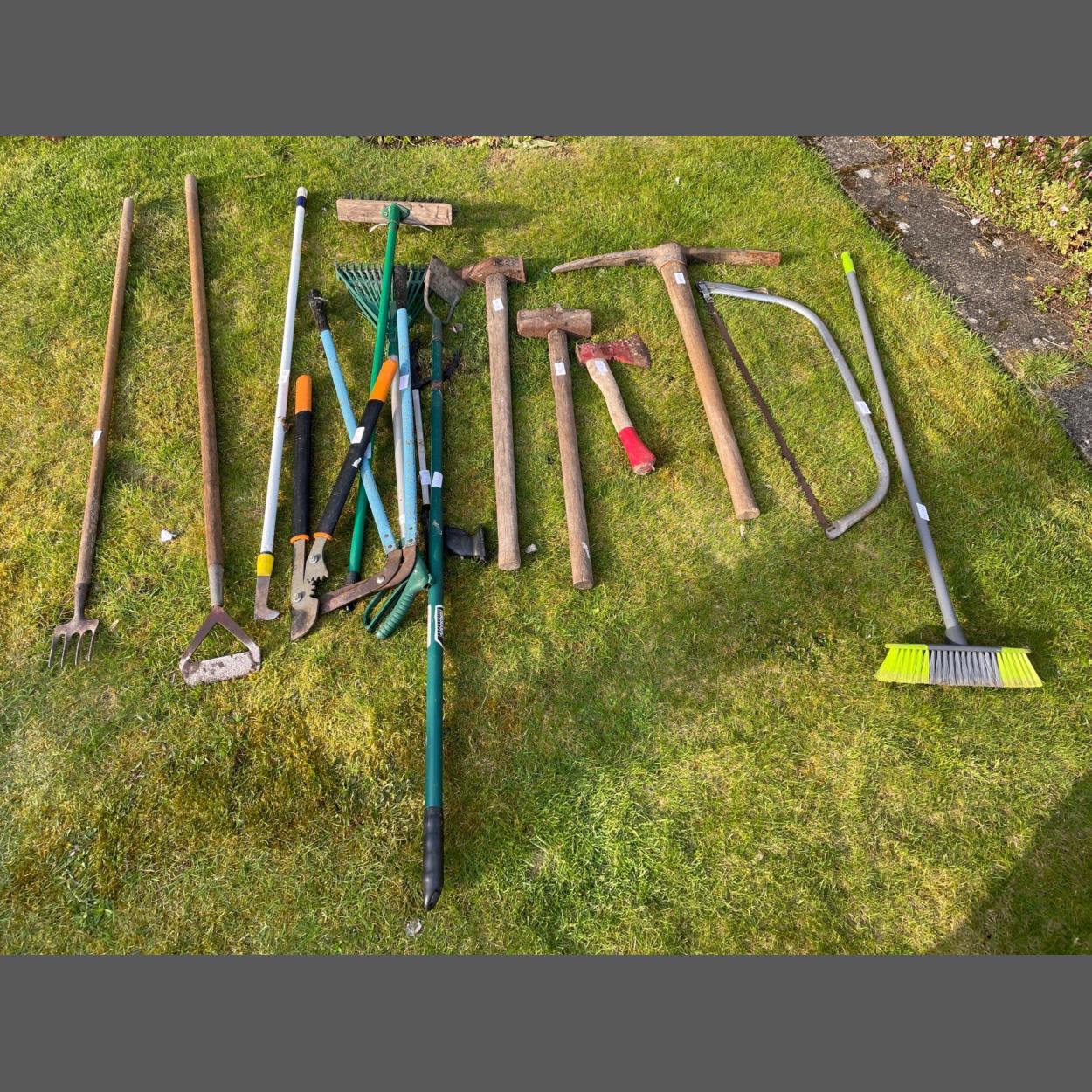 An assortment of garden tools to include a hoe LTD hammer large splitting axe etc etc