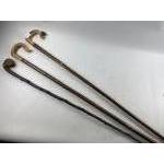 Three SHEPHERD'S CROOKS two with horn handles, one with carving of a dog's face 2 approx. 120cm the other approx 130cm long.