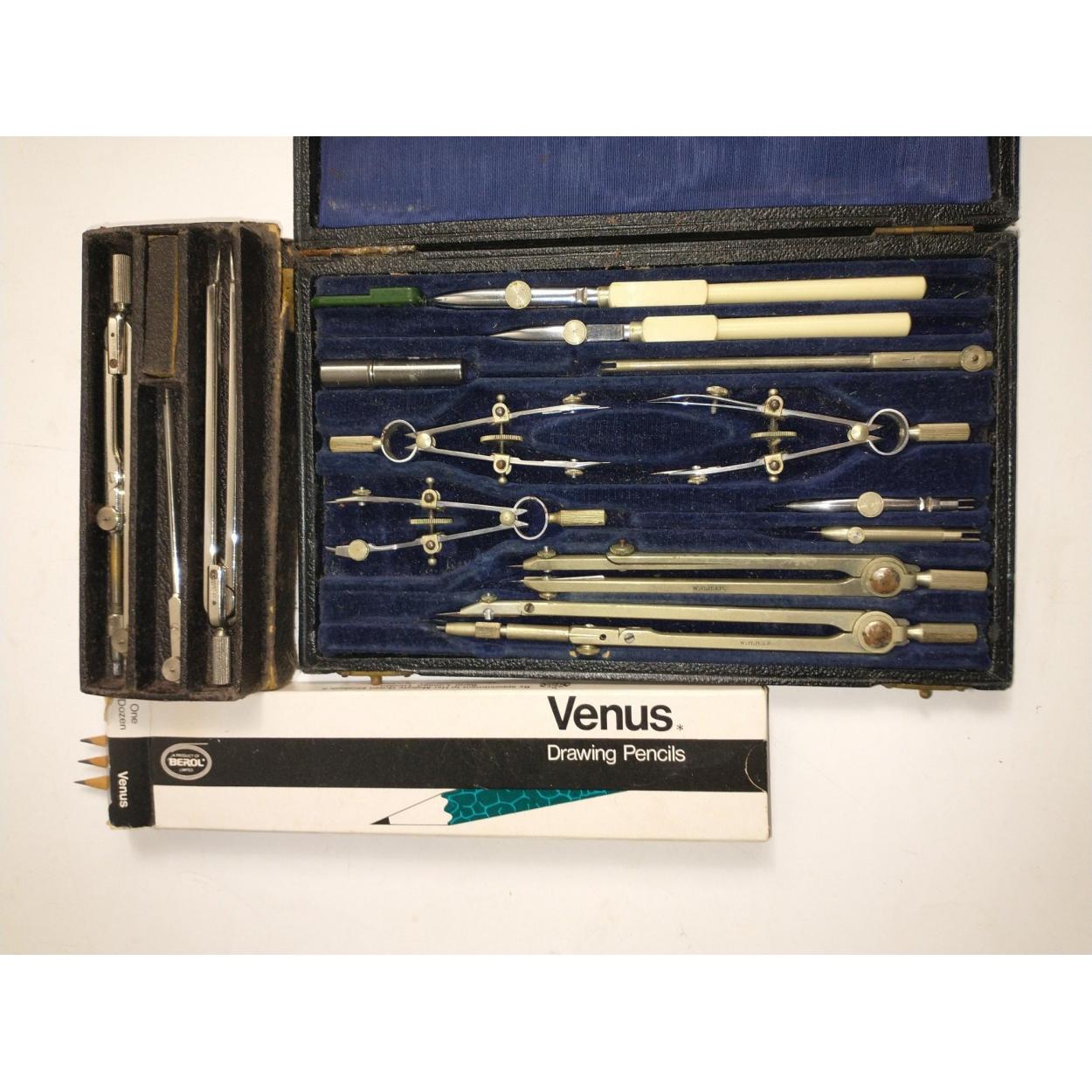 VINTAGE WHHLD MADE Patent No 35186 TECHNIcal DRAWING GEOMETRY cased set also with a vintage J WESS small boxed compass set WITH a set of HB DRAWING PENCILS with rubber tips!