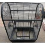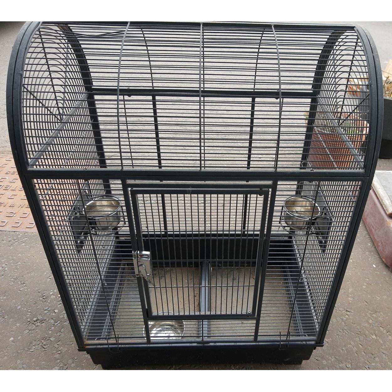 A large PARROT CAGE with metal feed bowls 100cm x 45cm wide.
