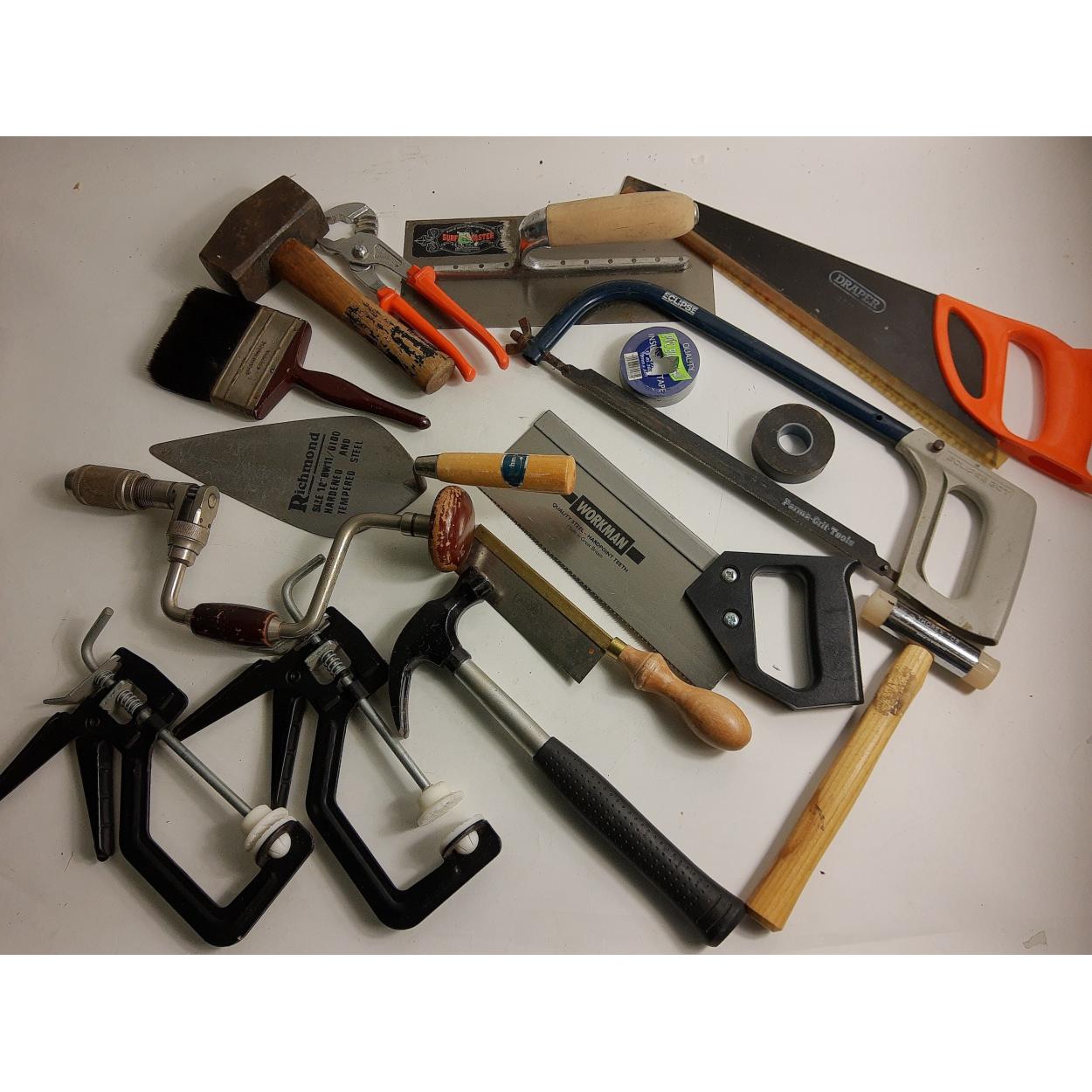 HAND TOOLS FOR THE DIY AFICIANDO - a collection to include hammers, saws, trowels, hand-drill, vices etc. A very useful lot.