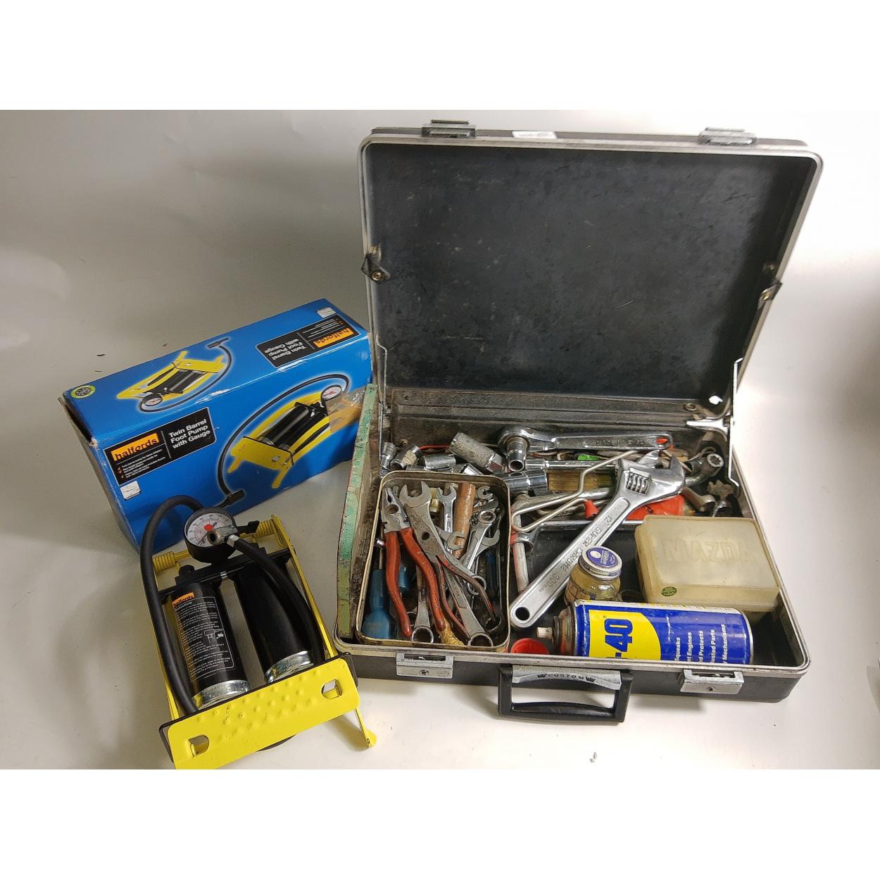 A DIY TOOLKIT contained within an old briefcase, contents include light bulbs for a MAZDA, spanners, pliers etc. also a HALFORDS twin barrel foot pump with gauge.