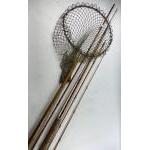 A 1911 HARDY PALAKONA split cane THE PERFECTION 2 piece 9'8" fly rod, serial number A65318, no bag (re-tipped) and a JS SHARPE of Aberdeen split cane 9 1/2' 3 piece fly rod in original bag plus a catcher's net.