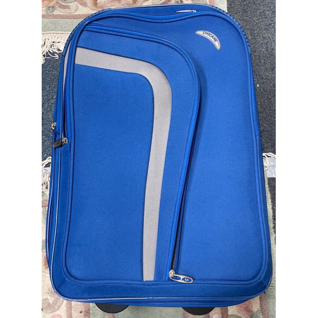 A CHICANE branded blue nylon covered suitcase with retracting handle and wheels dimensions 60cm height x 40cm length x 30cm depth approximate