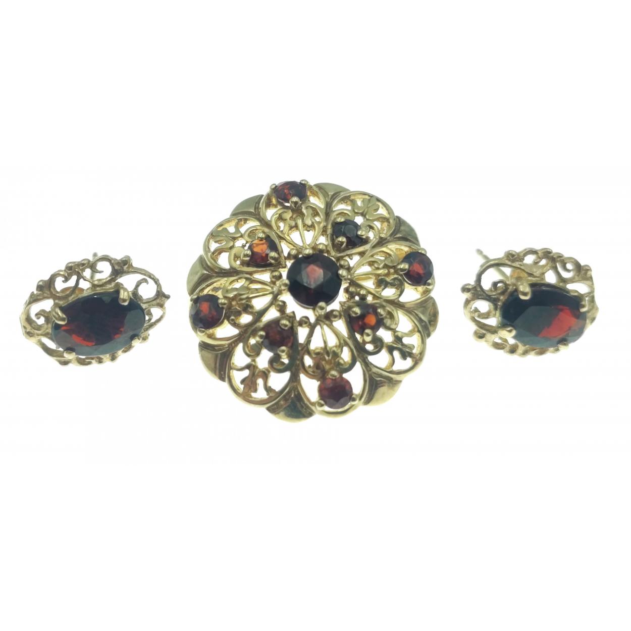 A small 375 stamped garnet pin brooch with matching earrings in heart shaped box. Combined gross weight 4.1g approx. A very pretty stylish little set. Pendant measures 19.3mm approx