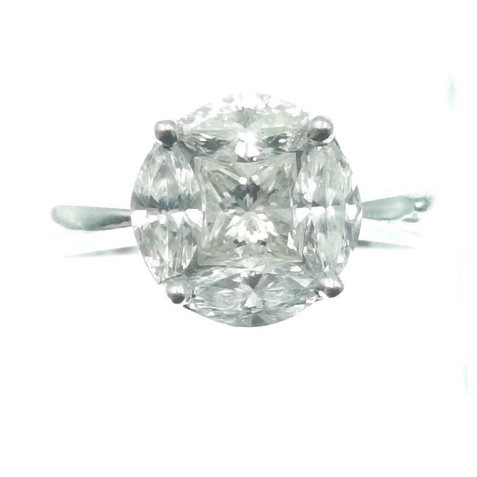 An 18ct stamped SUBSTANTIAL and GLAMOROUS LARGE DIAMOND (tested) ring 1ct approx - weight 4g gross - ring size M Set with a central 3.8mm square stone and surrounded with four 5mm tear drop shaped stones