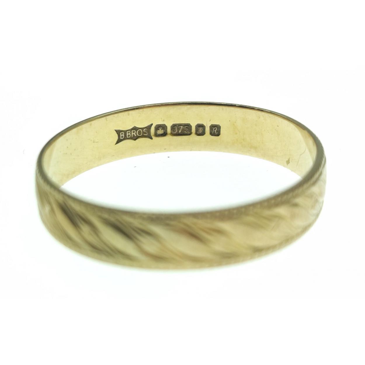A 375 fully hallmarked gold band with eight small diamonds. Size N, gross weight 4g approx