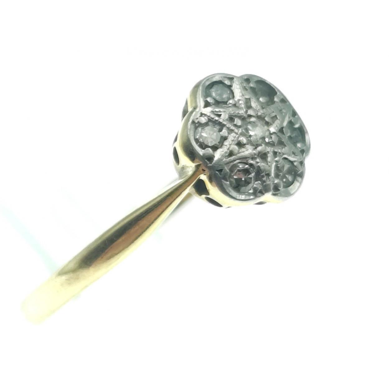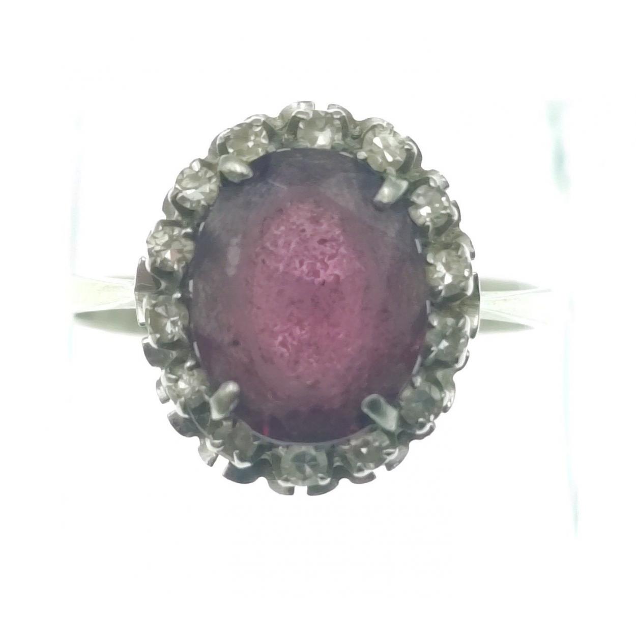 An 18ct stamped ring with white and red stones (looks like a wedding band originally with the stones 'stuck' on top!) - ring size Q weight 2.92g gross - also some unmarked yellow metal vintage pin brooches qty 3 gross weight 7.38g approx for info only