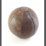 An antique leather medicine ball in good condition. 27cm tall. 90cm circumference.