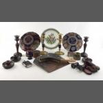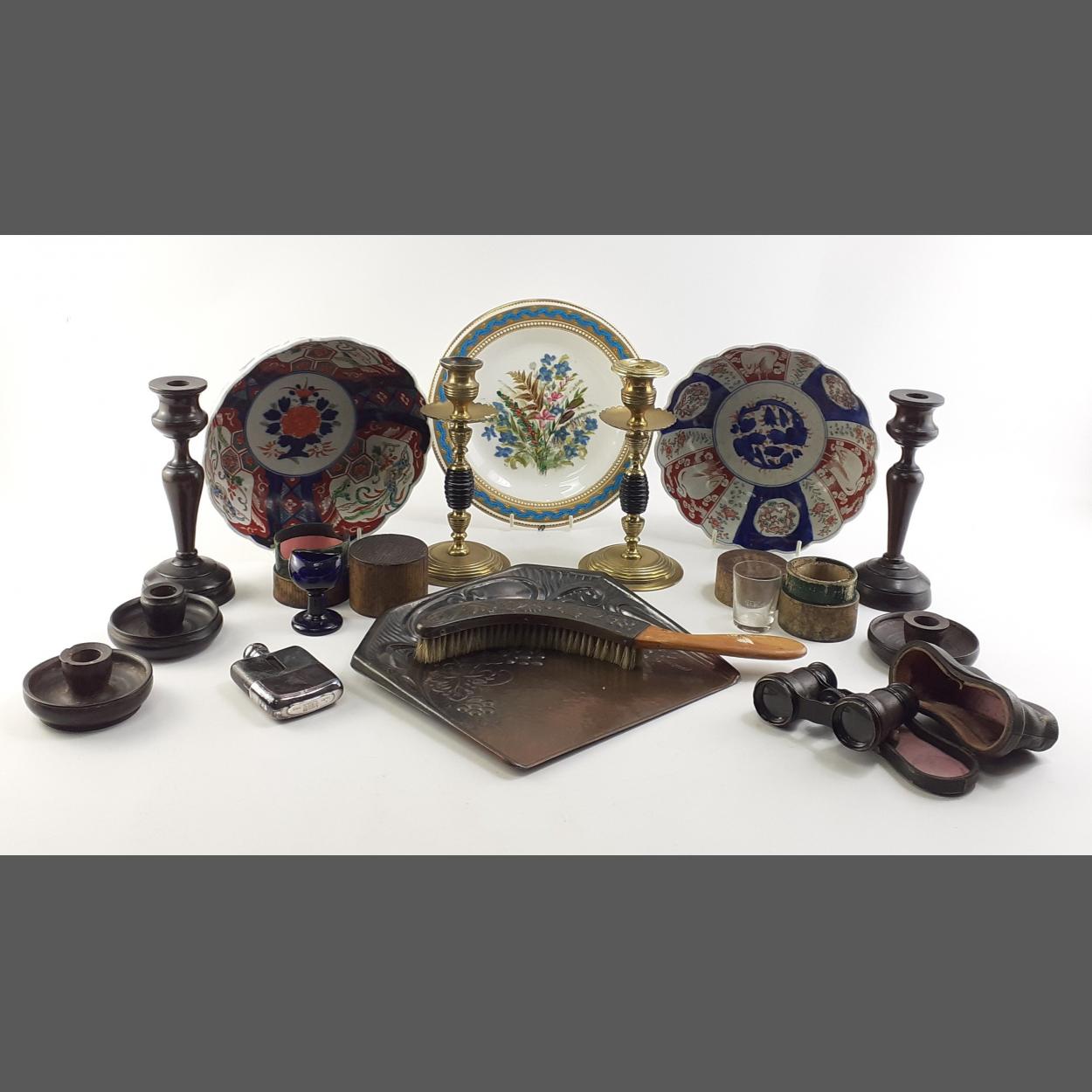 A mixed collectable decorative lot to include antique wooden and brass candle holders crumb tray and brush boxed medical glasses various ceramics, hip flask, etc