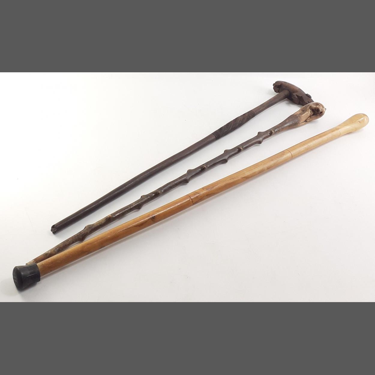 Three Vintage wooden walking sticks one has an ant eater carved top with some damage. tallest measures 90cm approx
