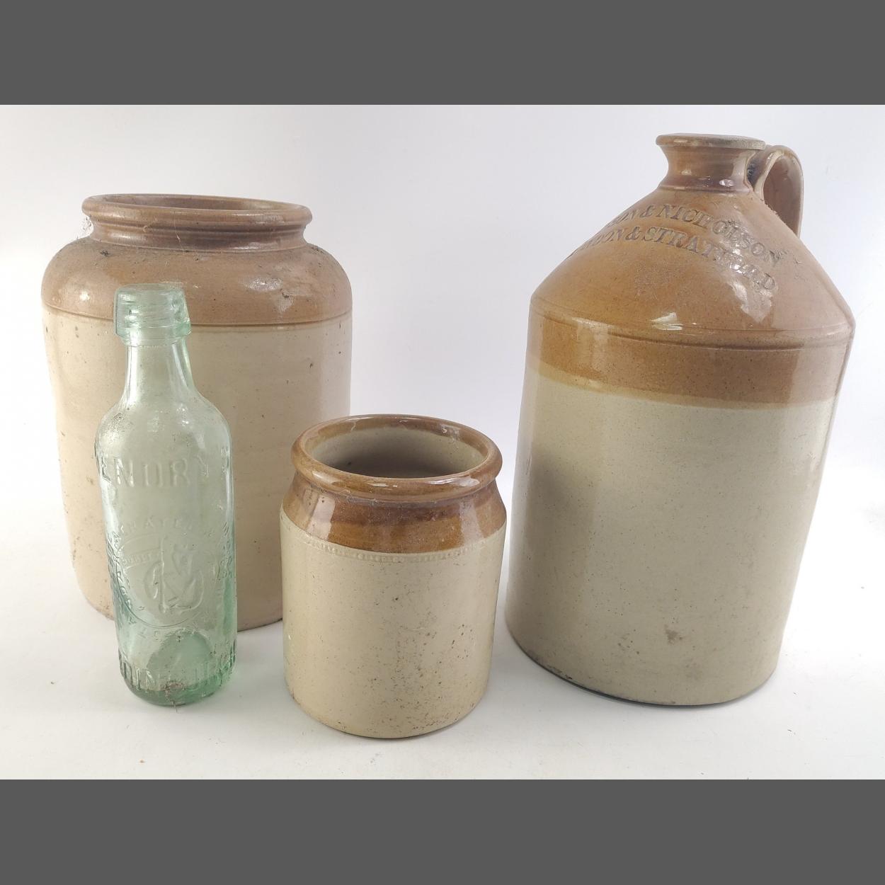 A stoneware flaggon from JENSON & NICHOLSON London & Stratford. Stands 32cm tall. Aso two other smaller stoneware pots and an antique bottle.