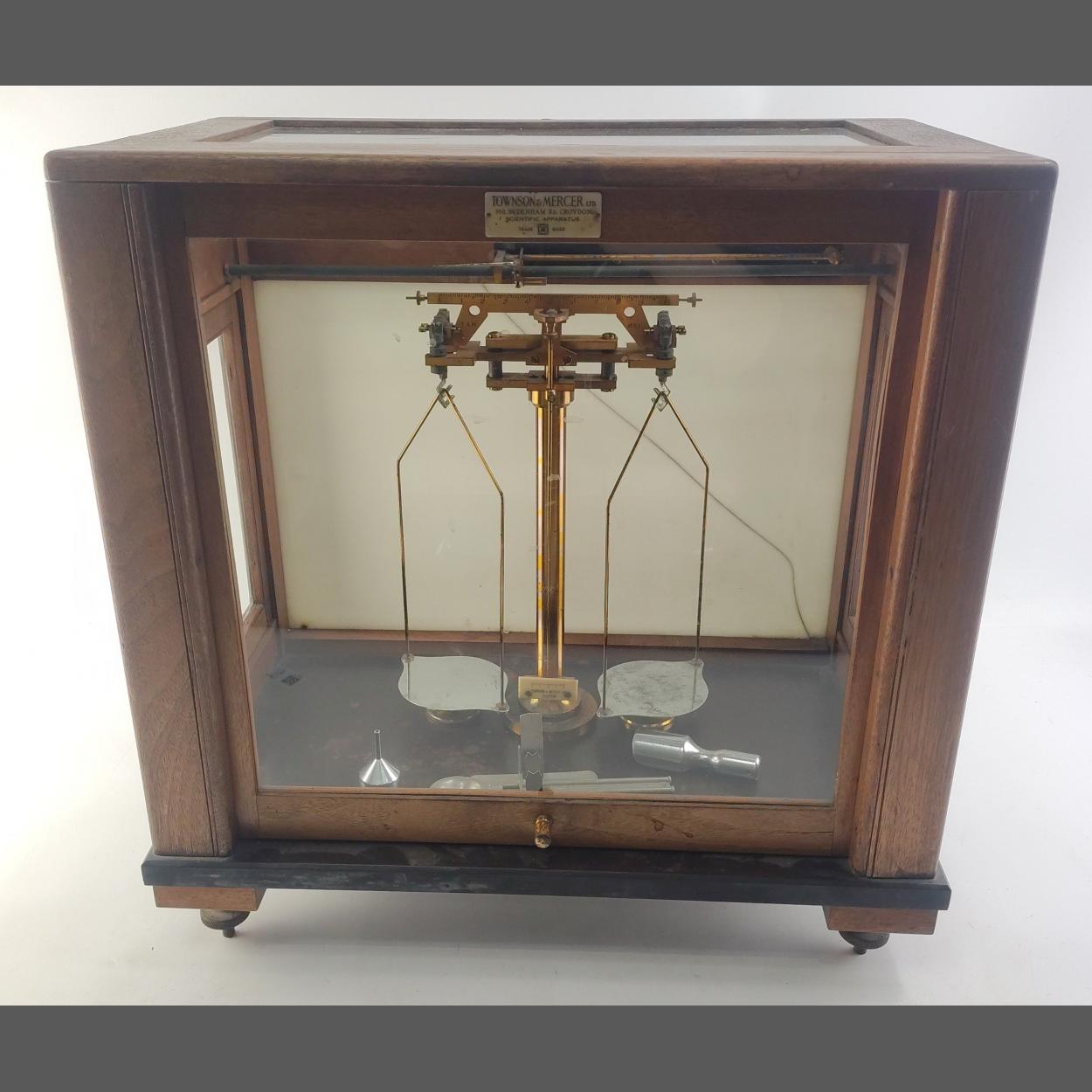 A super set of quality cased scientific measuring scales by TOWSON & MERCER.Case size 44cm x 41cm x 25cm. Appear complete and in good condition.