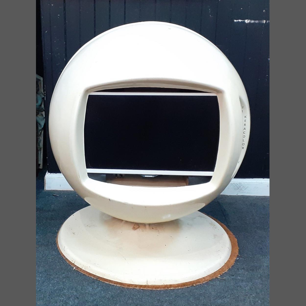 A mid century KERACOLOR sphere Television Housing Unit. Currently fitted with a modern flat screen. The metal dome and stand is discoloured but free from cracks and damage. A scarce find these days, just looking to be repurposed.