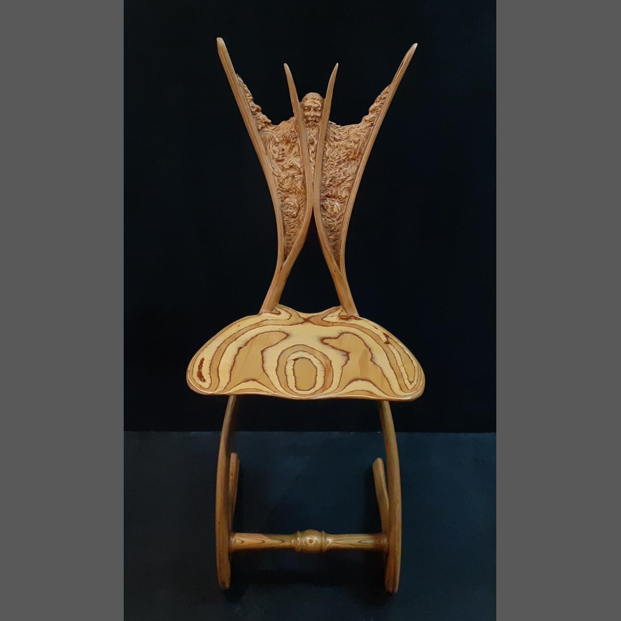 A unique piece. A stunning wood sculpted chair with intricate carving and swooping form, Bought in Arran 2003 and signed to the underside M Elliott. Marvin Elliott is a highly regarded and reknowned sculptor Standing 106cm tall. this is not just a chair, it is a piece of Art !