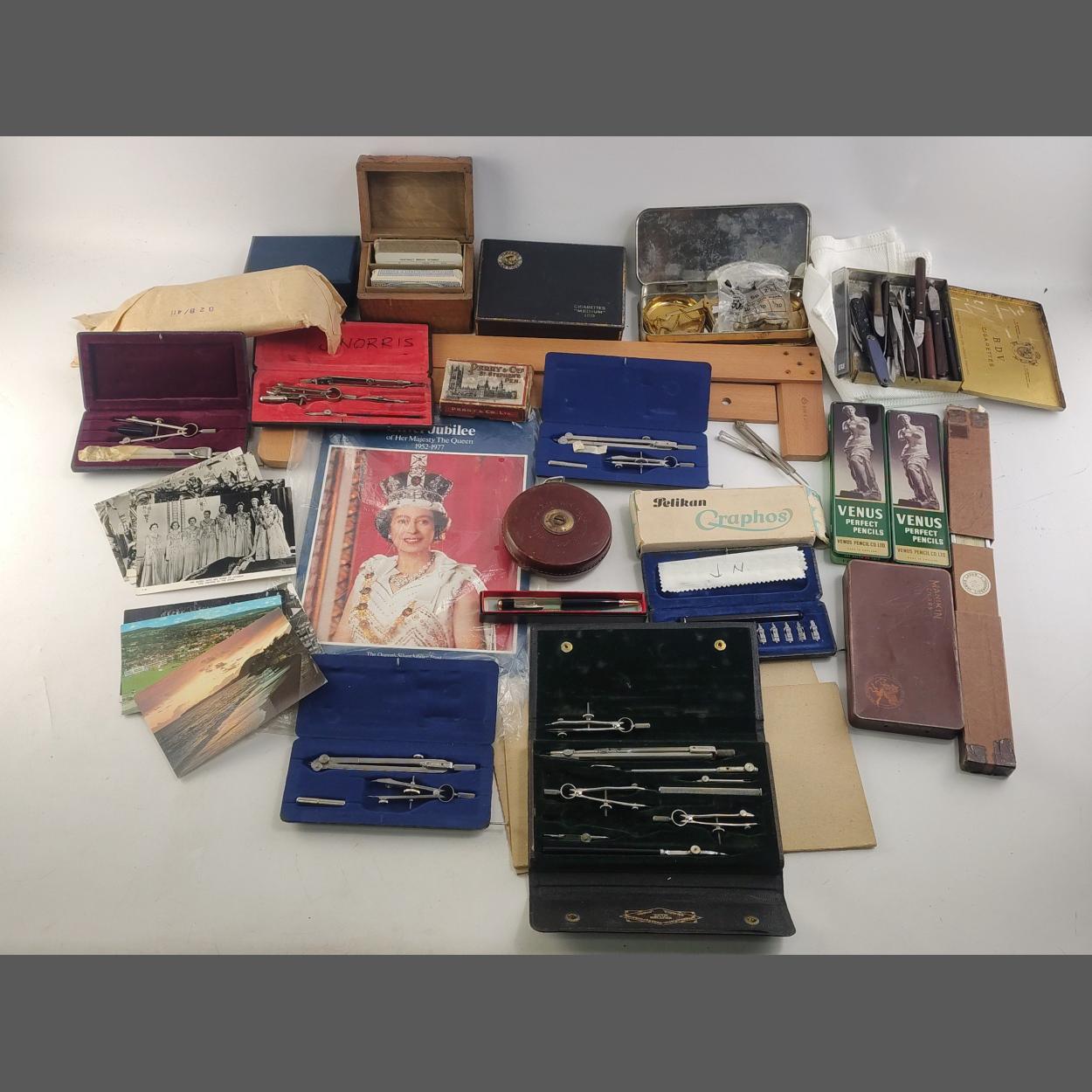 A collection of assorted scientific instruments in cases with measuring tape, Royal memorabilia etc. An interesting collection.