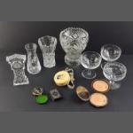 Mixed lot of crystal and glassware. vae, glasses childas clockwork toy, powder compact, a small braass compact and a Edward VII match safe A/F