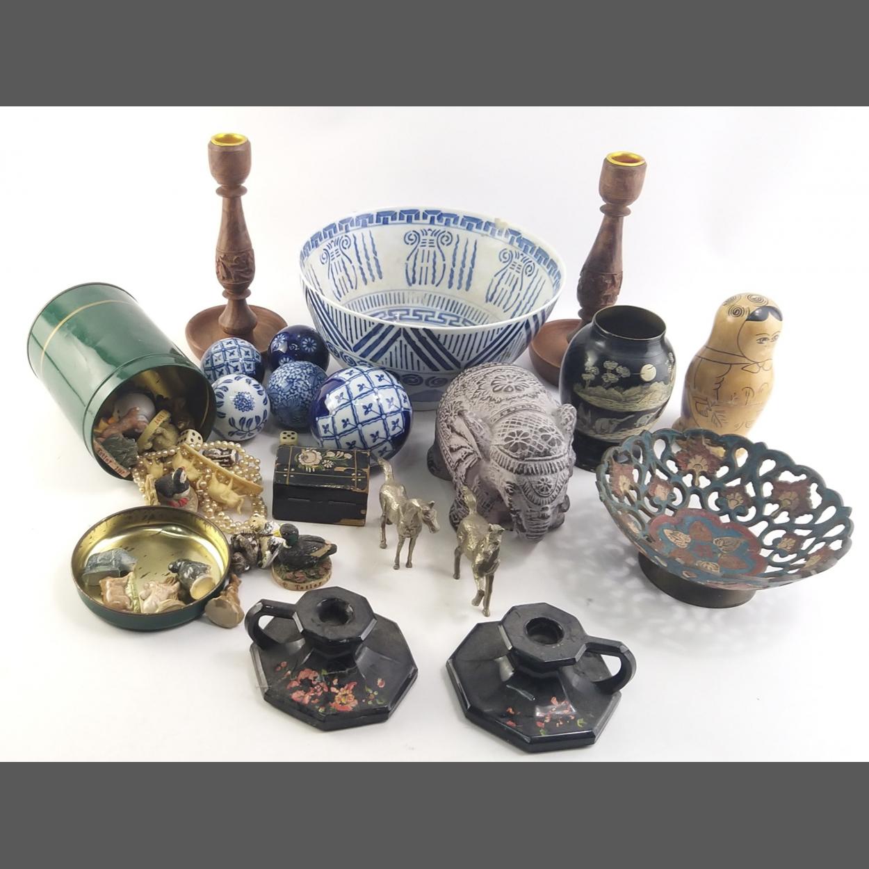 A mixed decorative lot to include black glass wee willie winkie candlesticks, a small enamel bowl, various oriental ceramics, candle stick, russian nesting dolls A/f and much else.