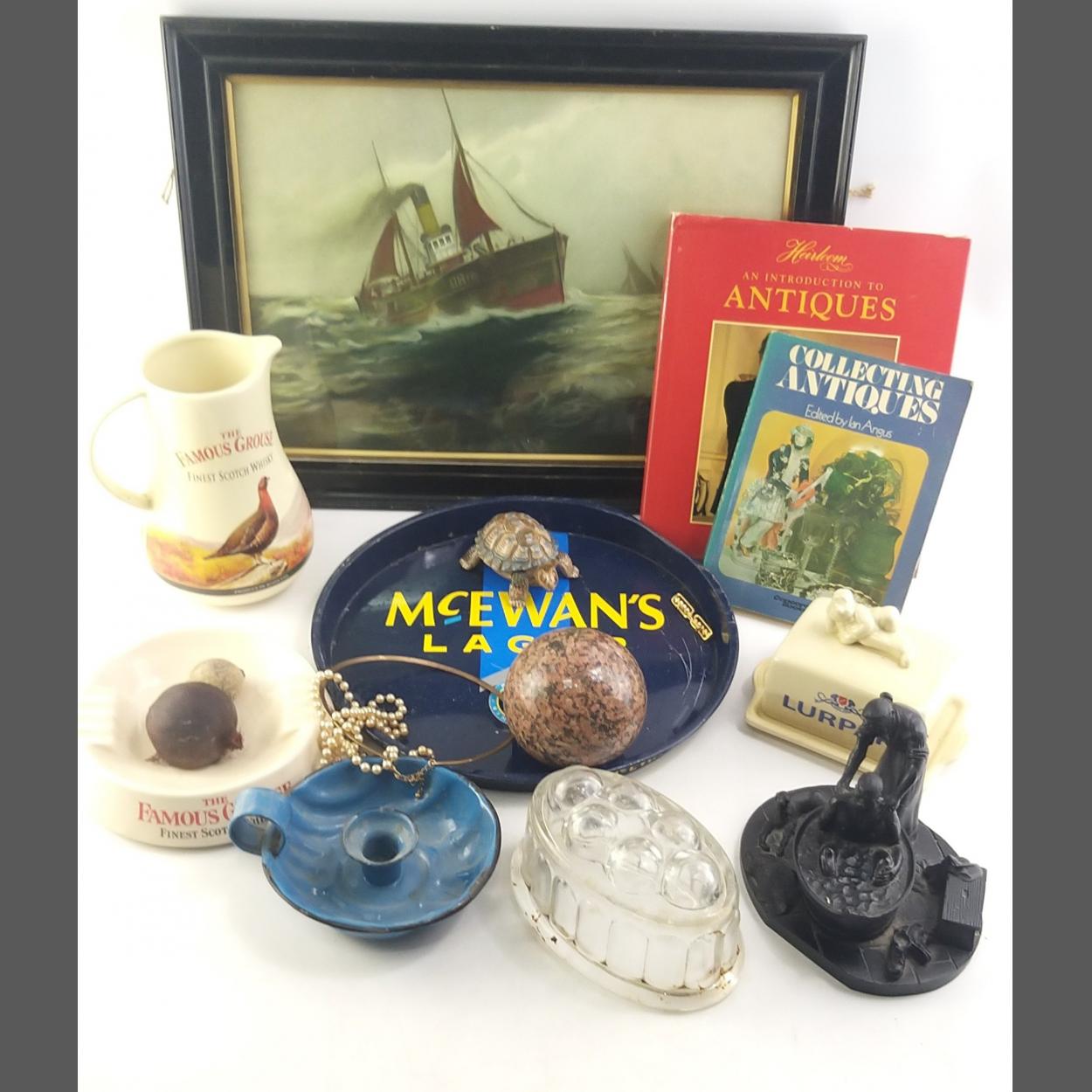 A mixed lot comprising blancmange mold, pub memorabilia, wee willie winkie lamp, Lurpak butter dish, print of boat etc.